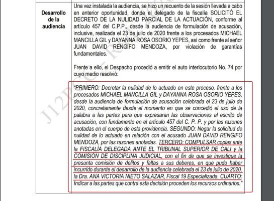 “TERCERO: COMPULSAR copias ante la FISCALÍA DELEGADA ANTE EL TRIBUNAL SUPERIOR DE CALI y la COMISIÓN DE DISCIPLINA JUDICIAL, con el fin de que se investigue la presunta comisión de delitos y faltas a sus deberes, en que pudo haber incurrido durante el desarrollo de la audiencia celebrada el 23 de julio de 2020, la Dra. ANA VICTORIA NIETO SALAZAR, Fiscal 19 Especializada” Señala el fallo del juzgado 12 de Conocimiento de Cali.