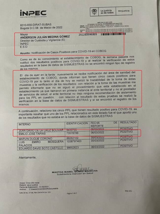 A pesar de esa advertencia, hay un informe del INPEC con fecha del 8 de marzo que señala que supuestamente “el ente territorial no dejó ninguna recomendación de aislamiento”, incluso asegura que no tenía registros de los casos positivos. Consultado el INPEC, aseguran desde allí que se abrió una investigación por este caso.