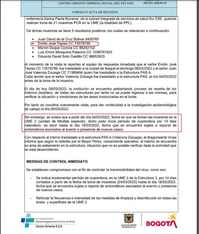 La semana pasada, desde el INPEC se aseguró que los resultados que había mostrado Tapia supuestamente, era falso para retrasar el traslado. Sin embargo, un informe de la Secretaría de Salud de Bogotá con fecha del 3 de marzo, indica que Emilio Tapia y cuatro reclusos más del Pabellón de Medidas Especiales de la cárcel La Picota eran positivos.