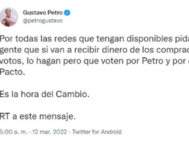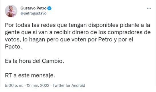 Esto, luego de que el día anterior a los comicios, Petro publicara un mensaje en Twitter : “Por todas las redes que tengan disponibles pídanle a la gente que si van a recibir dinero de los compradores de votos lo hagan, pero que voten por Petro y por el Pacto”.