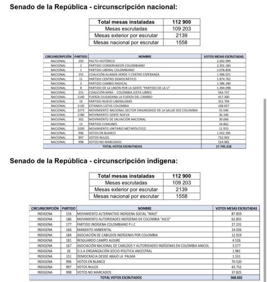 En cuanto al escrutinio de las votaciones para Senado de la República, circunscripción nacional, el registrador nacional Alexander Vega confirmó que se ha logrado un 97%, pues del total de las 112.900 mesas, faltan por escrutarse 2.139 mesas en el exterior y 1.558 en el país. Así las cosas, con 109.203 mesas escrutadas, el balance del organismo electoral es el siguiente:
