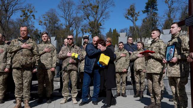 Sepelio de un soldado ucraniano muerto durante la invasión militar rusa. Foto: Getty
