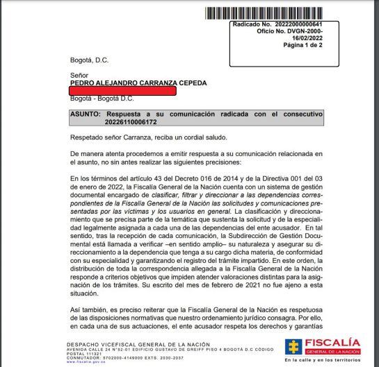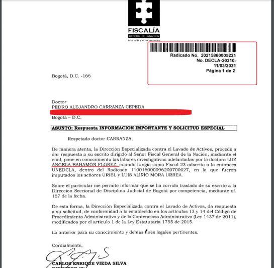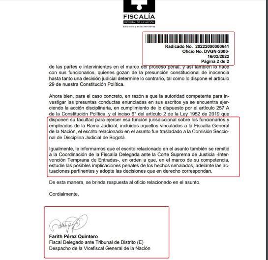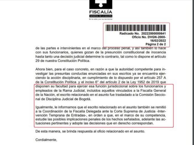 “el escrito relacionado en el asunto fue trasladado a la Comisión Seccional de Disciplina Judicial de Bogotá (…) Igualmente, le informamos que el escrito relacionado en el asunto también se remitió a la Coordinación de la Fiscalía Delegada ante la Corte Suprema de Justicia -Intervención Temprana de Entradas-, en orden a que, en el marco de su competencia, estudie las posibles implicaciones penales de los hechos señalados, adelante las actuaciones pertinentes y adopte las decisiones que en derecho correspondan”. Indica un documento de la Fiscalía.