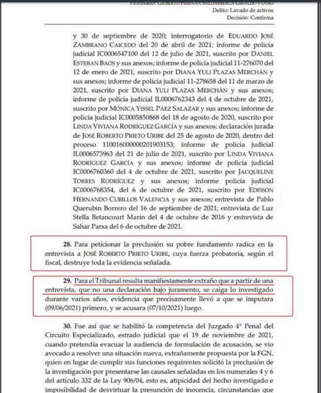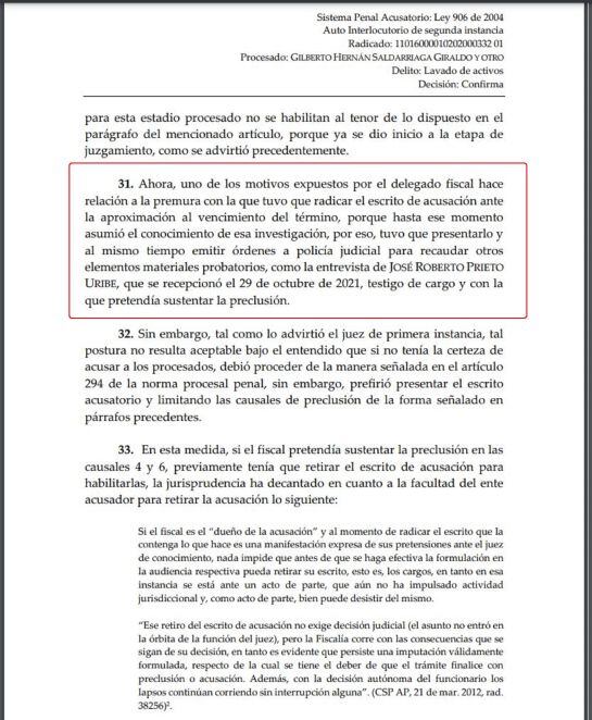 “Ahora, uno de los motivos expuestos por el delegado fiscal hace relación a la premura con la que tuvo que radicar el escrito de acusación ante la aproximación al vencimiento del término, porque hasta ese momento asumió el conocimiento de esa investigación, por eso, tuvo que presentarlo y al mismo tiempo emitir órdenes a policía judicial para recaudar otros elementos materiales probatorios, como la entrevista de JOSÉ ROBERTO PRIETO URIBE, que se recepcionó el 29 de octubre de 2021, testigo de cargo y con la que pretendía sustentar la preclusión”…dice el fallo del Tribunal.