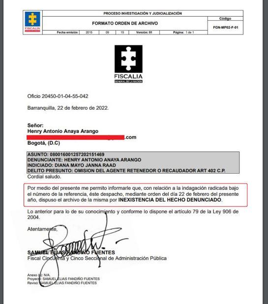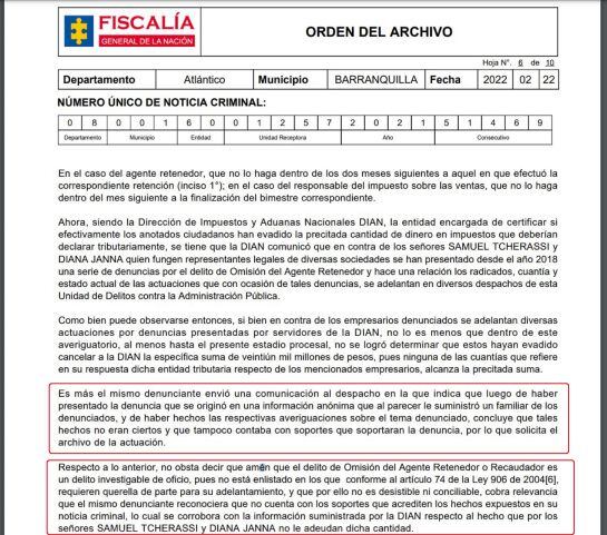 La Fiscalía indagó y encontró que esa denuncia fue una mentira, pues el veedor Henry Anya, una vez fue requerido por el ente acusador para ampliar su versión, retiró la denuncia alegando que la información que le había llegado se originó en una fuente anónima dada al parecer por un familiar de los empresarios.