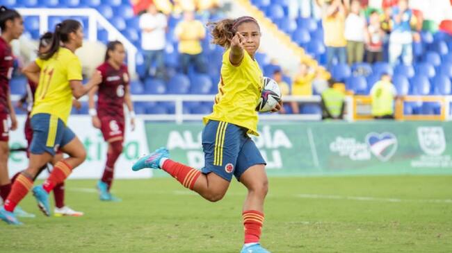 Leicy Santos festeja uno de los goles de Colombia en el empate ante Venezuela. / FCF