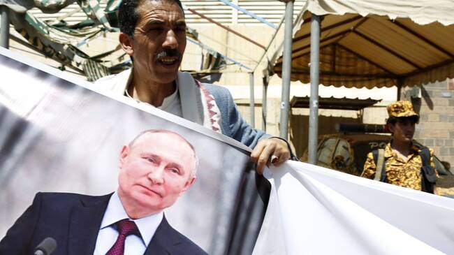 Ciudadanos muestran apoyo a Putin en la embajada de Rusia en Yemen. / . (Getty)
