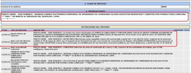 De acuerdo con la página de la rama judicial, el juez décimo de Ejecución de Penas remitió la decisión vía correo a la Escuela de Posgrados de la Policía, donde estaba recluido Prieto para que a partir del próximo domingo se haga efectiva la boleta de libertad.