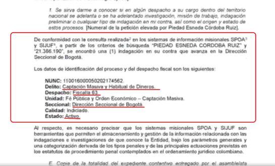 Como lo anticipó 6AM HOY POR HOY, un documento de la Fiscalía de respuesta a la senadora electa Piedad Córdoba indica que en su contra hay una indagación activa por el delito de captación masiva y habitual de dineros.