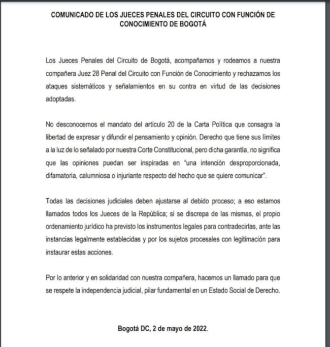 Y por último hicieron un llamado para que se respete la independencia judicial, pilar fundamental en un Estado Social de Derecho.