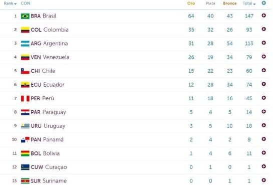 Según la tabla general, la selección nacional logró 35 medallas de oro, 32 de plata y 28 de bronce, cumpliendo el objetivo de escoltar a Brasil, que consiguió 147 preseas (64 de oro, 40 de plata y 43 de bronce). Argentina consiguió 93 metales (31 de oro, 28 de plata y 54 de bronce).