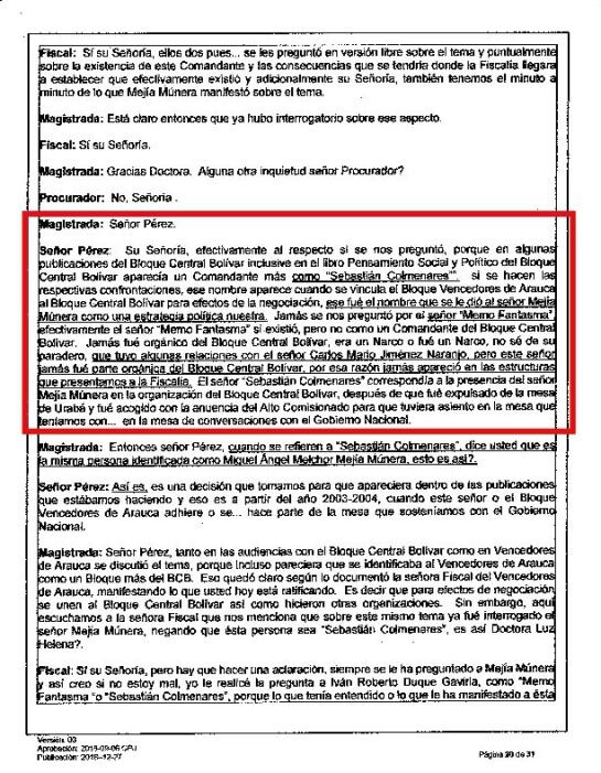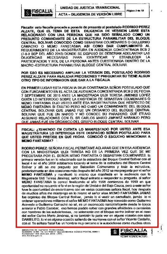 En la versión que rindió ante Justicia y Paz en 2015, alias Julián Bolívar le dijo a una magistrada y a la Fiscalía que "‘Memo Fantasma’ sí existió, pero no como un comandante, jamás fue orgánico del Bloque Central Bolívar, que era un narco puro, que tuvo relaciones con el señor Carlos Mario Jiménez alias ‘Macaco’ y que por esa razón jamás apareció en las estructuras que presentaron a la Fiscalía”. También aseguró que no conoce su identidad.