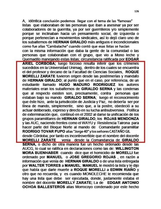 “(…) forzoso resulta inferir que los crímenes sucedidos en la Universidad Unimag, dentro de los cuales se encuentra el del profesor y decano de la Facultad de Ciencias Sociales, ROQUE MORELLI ZARATE tuvieron origen desde las postrimerías y mandato de HERNAN GIRALDO; al punto que, en el caso, por referencia, de un estudiante llamado HUGO MADURO RODRIGUEZ los autores materiales eran los subalternos de GIRALDO SERNA”.