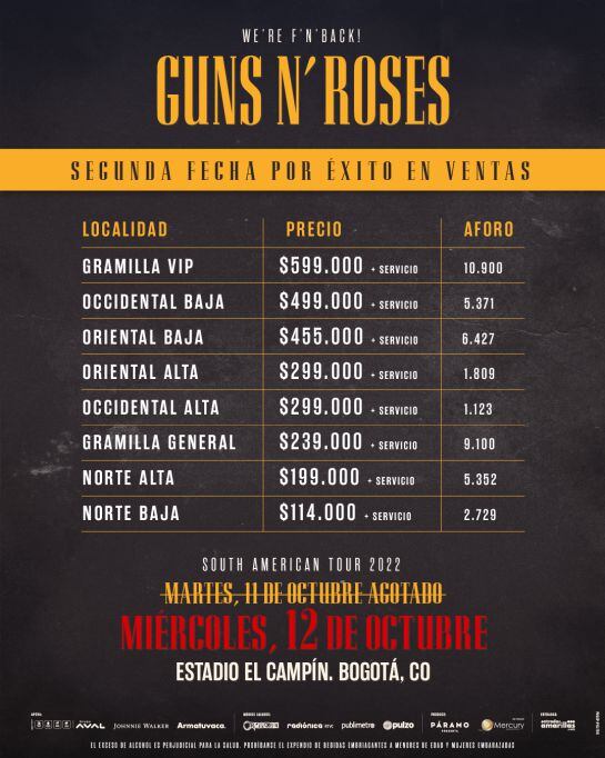 El regreso de Guns N' Roses ha congregado a millones de fanáticos en el país, quienes, agotaron en pocas horas las boletas de su show del próximo 11 de octubre en Bogotá, con más de 40 mil boletas vendidas. El concierto será en el Estadio Nemesio Camacho 'El Campín'.