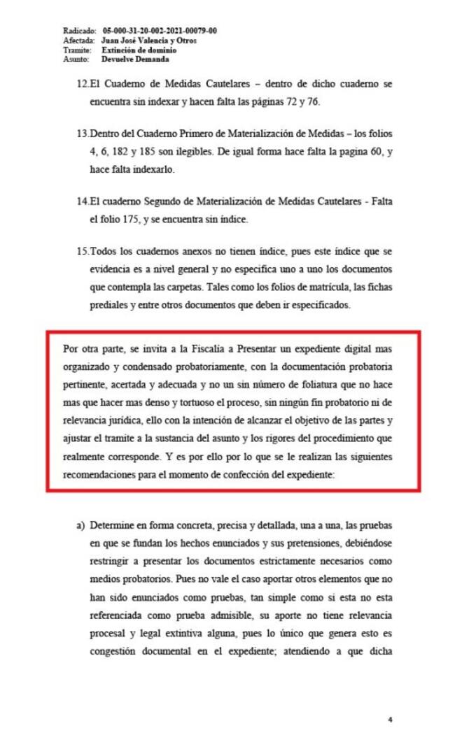 “Se invita a la Fiscalía a presentar un expediente digital más organizado y condensado probatoriamente y no un sin número de foliatura que no hace más que hacer más denso y tortuoso el proceso (…)”, señaló.