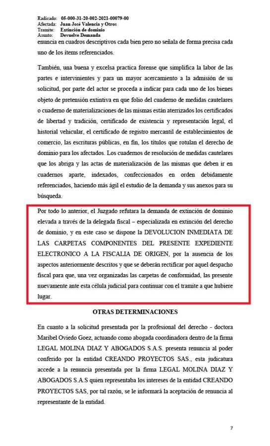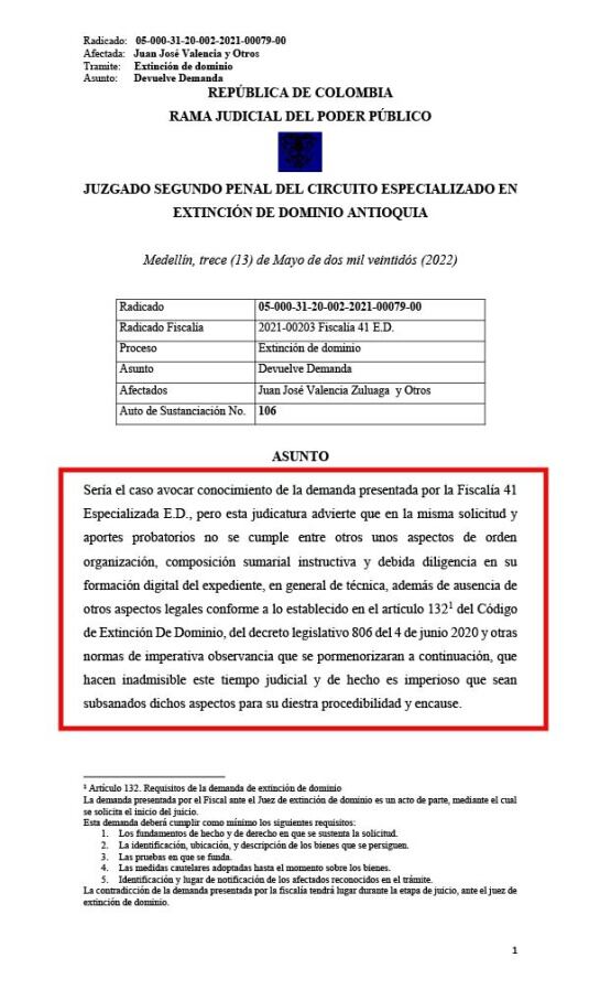 "Esto conlleva necesariamente a que se ha vencido el término establecido por el Código de Extinción de Dominio para presentar la demanda, para que duren las medidas cautelares, y por lo tanto tienen que levantar las medidas y tienen que devolver todos los bienes del señor Juan José Valencia Zuluaga y los de sus empresas”, afirmó el abogado defensor Hernando Nates.