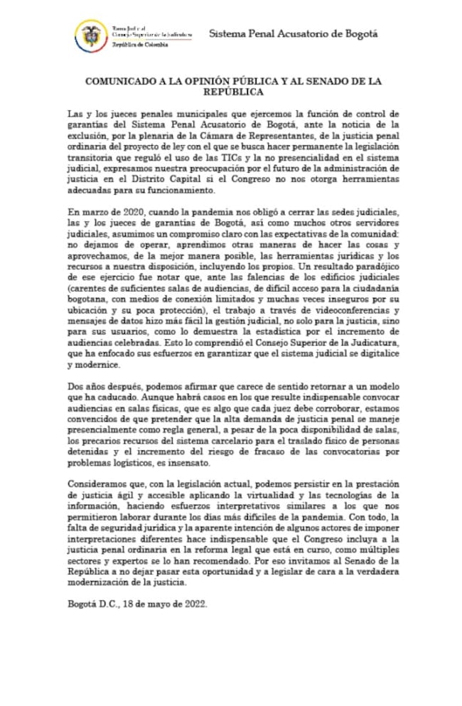 “(…) estamos convencidos de que pretender que la alta demanda de justicia penal se maneje presencialmente como regla general, a pesar de la poca disponibilidad de salas, los precarios recursos del sistema carcelario para el traslado físico de personas detenidas y el incremento del riesgo de fracaso de las convocatorias por problemas logísticos, es insensato”. Indica el comunicado.
