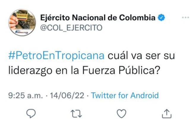 Sin embargo, en medio de la entrevista un trino causó bastante curiosidad, pues provenía de la cuenta oficial del Ejército Nacional de Colombia. En este usaron el hashtag promovido por la emisora y cuestionaron lo siguiente: "#PetroEnTropicana cuál va a ser su liderazgo en la Fuerza Pública?"