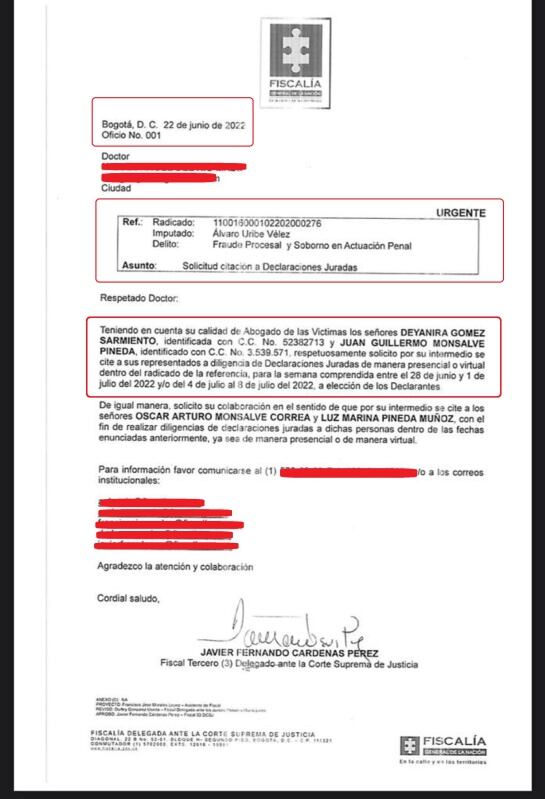 El fiscal del caso también pide al abogado que por intermediación suya, se cite a Óscar Arturo Monsalve y Luz Marina Pineda Muñoz, padre y madre de Juan Guillermo Monsalve.