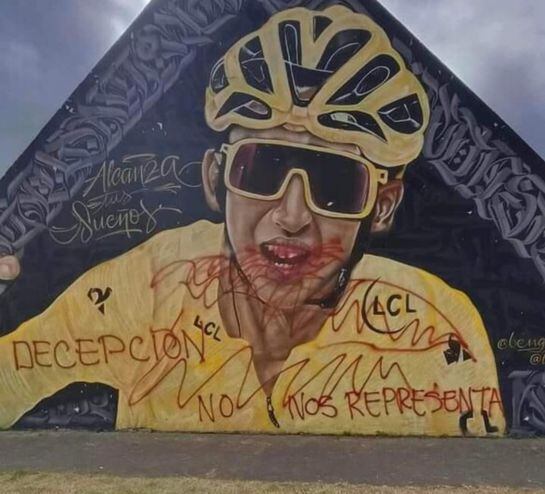 En redes sociales han circulado diferentes imágenes en las que se evidencia que el mural artístico con la imagen del ciclista Egan Bernal ubicado en Zipaquirá fue vandalizado. El rostro del ciclista fue pintado con aerosol rojo y le fue escrita la frase “Decepción, no nos representa”.