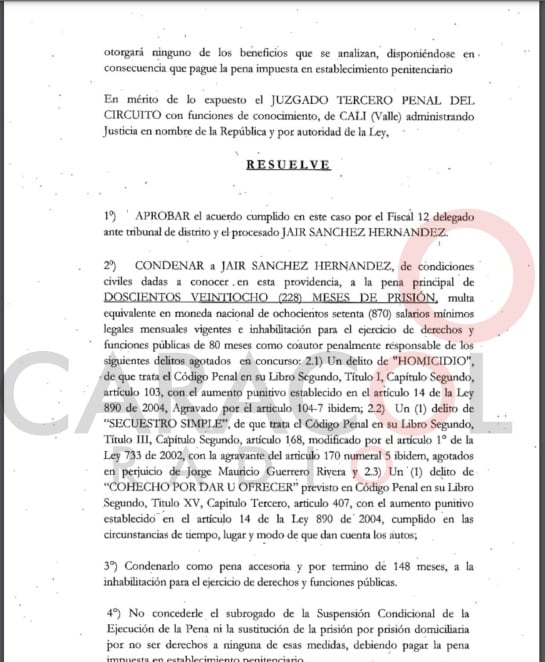 Jair Sánchez Hernández alias ‘Mueble Fino’ fue condenado a 19 años de prisión tras haber llegado a un preacuerdo con la Fiscalía y en el que se declaró culpable por los delitos de homicidio, secuestro simple y cohecho por dar u ofrecer.