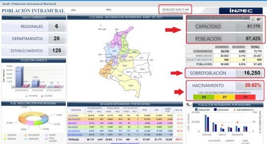 La capacidad carcelaria es para 81.175 reclusos, pero los datos del INPEC indican que hay un registro de 97.425 reclusos en las 128 cárceles que tiene Colombia.