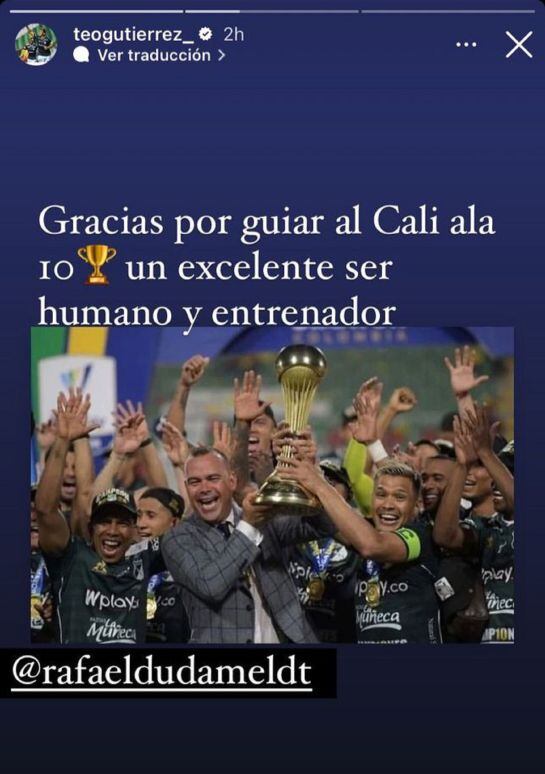 Ante esto, comenzó a tomar fuerza la salida de Dudamel y ahora Teófilo Gutiérrez despidió al técnico que le dio el último título al club. "Gracias por guiar al Deportivo Cali a la 10. Un excelente ser humano y entrenador", publicó en sus redes sociales el jugador.