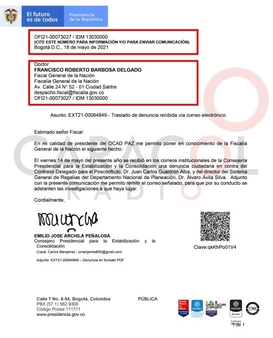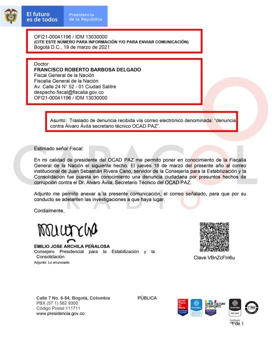 Caracol Radio conoció algunas de esas pruebas. Entre estas aparece desde el 19 de marzo de 2021 un oficio enviado por la Consejería Presidencial para la Estabilización al fiscal Francisco Barbosa, para que fueran investigados presuntos hechos de corrupción contra Álvaro Ávila, para ese momento secretario técnico del OCAD PAZ (VER DOCUMENTO 1)
