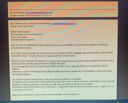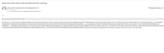 Correo adjunto a la primera denuncia por presunta corrupción con dineros destinados para la Paz / CARACOL RADIO