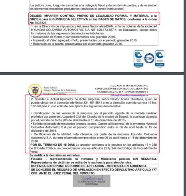 Se autorizó a la Fiscalía buscar en la DIAN liquidaciones, copias de las declaraciones de renta y complementarios gravables para el año 2016; Impuesto al Valor Agregado (IVA) del 2016; y retención en la fuente para el mismo periodo.