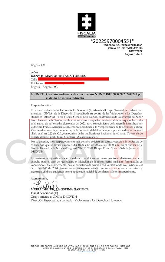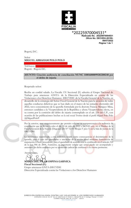 Caracol Radio conoció que Fiscalía citó a conciliación al abogado y exdirector del CTI Julián Quintana y al ‘influencer’ Miguel Polo por el delito de injuria en contra de la vicepresidenta electa Francia Márquez