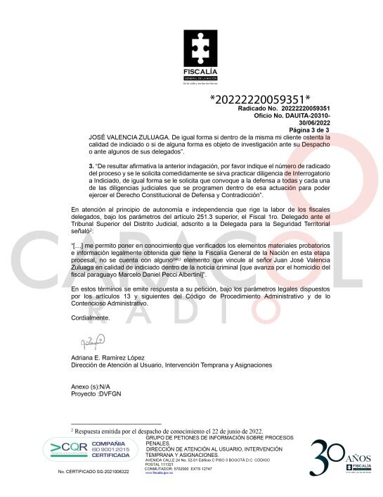 “verificados los elementos materiales probatorios e información legalmente obtenida que tiene la Fiscalía General de la Nación en esta etapa procesal, no se cuenta con algún (sic) elemento que vincule al señor Juan José Valencia Zuluaga en calidad de indiciado dentro de la noticia criminal [que avanza por el homicidio del fiscal paraguayo Marcelo Daniel Pecci Albertini]”