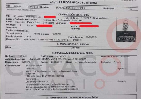 En la reseña criminal figura que es sindicado por los delitos de secuestro simple; homicidio; administración de recursos relacionados con actividades terroristas; concierto para delinquir; terrorismo.