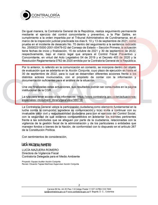 La Contraloría General aclaró que ya venía haciendo un seguimiento a las obras por orden del Tribunal, para lo cual se está recaudando la información y documentación para el análisis de la situación. Los resultados podrán ser consultados en la página institucional de la entidad después del próximo 30 de septiembre.