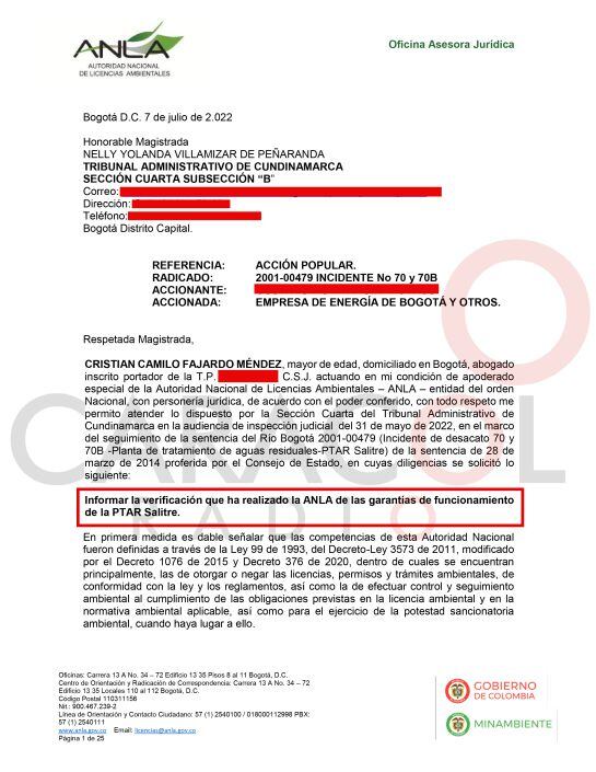 De hecho, Caracol Radio conoció otro documento, esta vez de la Agencia Nacional de Licencias Ambientales (ANLA) emitido el pasado 6 de junio, en donde verificó las garantías de funcionamiento de la PTAR Salitre, en cuanto al tratamiento de aguas y lodos.
