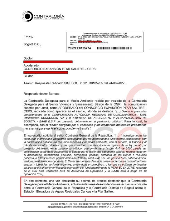 Esto después de que el contratista denunciara el 24 de junio de 2022 a la CAR de Cundinamarca, su interventor, el IVK, y al Acueducto de Bogotá por presuntas irregularidades en el manejo de la PTAR Salitre, que podrían derivar en un posible detrimento al patrimonio público.