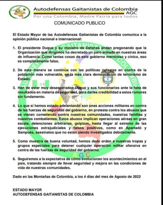 En un comunicado el Clan de Golfo habría anunciado el cese de los ataques que ha dejado decenas de policías y militares muertos. Señalan que “como muestra de buena voluntad, hemos dado orden a nuestras tropas y grupos especiales para detener cualquier operación militar ofensiva en contra de las fuerzas de seguridad del gobierno”.