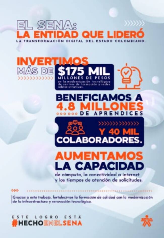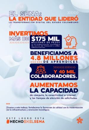 Al menos 4.8 millones de aprendices del Sena se han beneficiado con esta modernización digital, pues indudablemente, aumentó la capacidad de la conectividad a internet, de cómputo y de la atención a solicitudes.