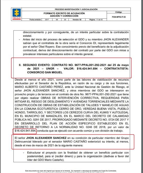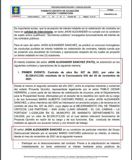 Escrito de acusación en contra de Jhon Alexánder Sánchez, supuesto estructurador de la red del senador Mario Castaño / CARACOL RADIO