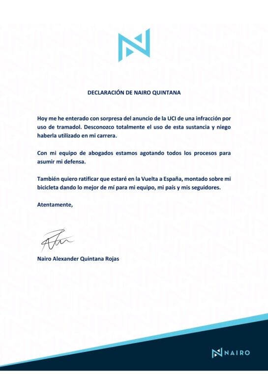 El boyacense se manifestó tras la sanción impuesta por la UCI. / Comunicado de Nairo Quintana.