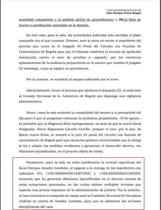 En un fallo de tutela, el Tribunal concluyó que es excesivo que esos casos lleven siete años y que no haya iniciado el juicio por dilaciones injustificadas del exfiscal 79 Especializado de Bogotá, Enrique Amador Londoño, y por ello compulsaron copias para que lo investiguen disciplinariamente.
