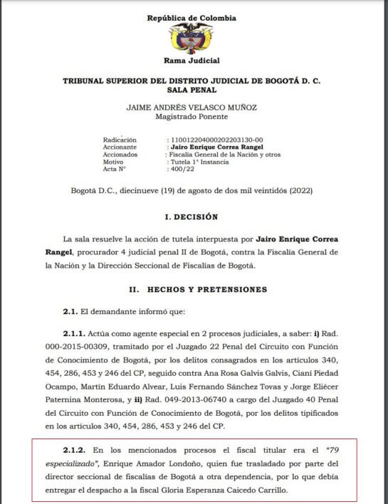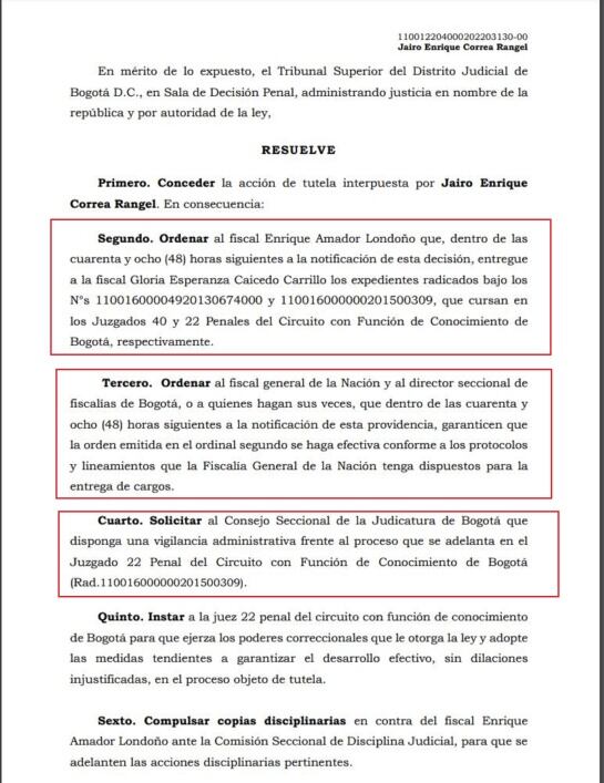 Los magistrados ordenaron al ente acusador garantizar que en 48 horas ese fiscal entregue la oficina y los procesos a la nueva fiscal designada. También se ordenó al Consejo Seccional de la Judicatura de Bogotá que disponga una vigilancia administrativa frente al proceso.