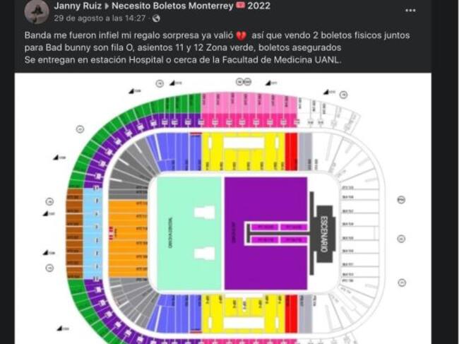Banda me fueron infiel, mi regalo sorpresa ya valió, vendo 2 boletos físicos juntos para Bad Bunny son fila O, asientos 11 y 12 zona verdes, boletos asegurados. Se entregan en estación hospital o cerca de la Facultad de Medicina UANL”.