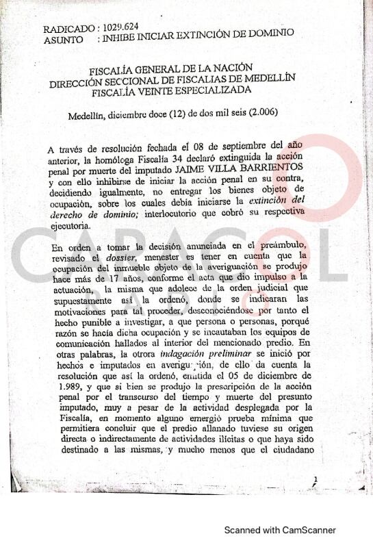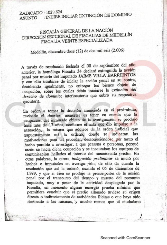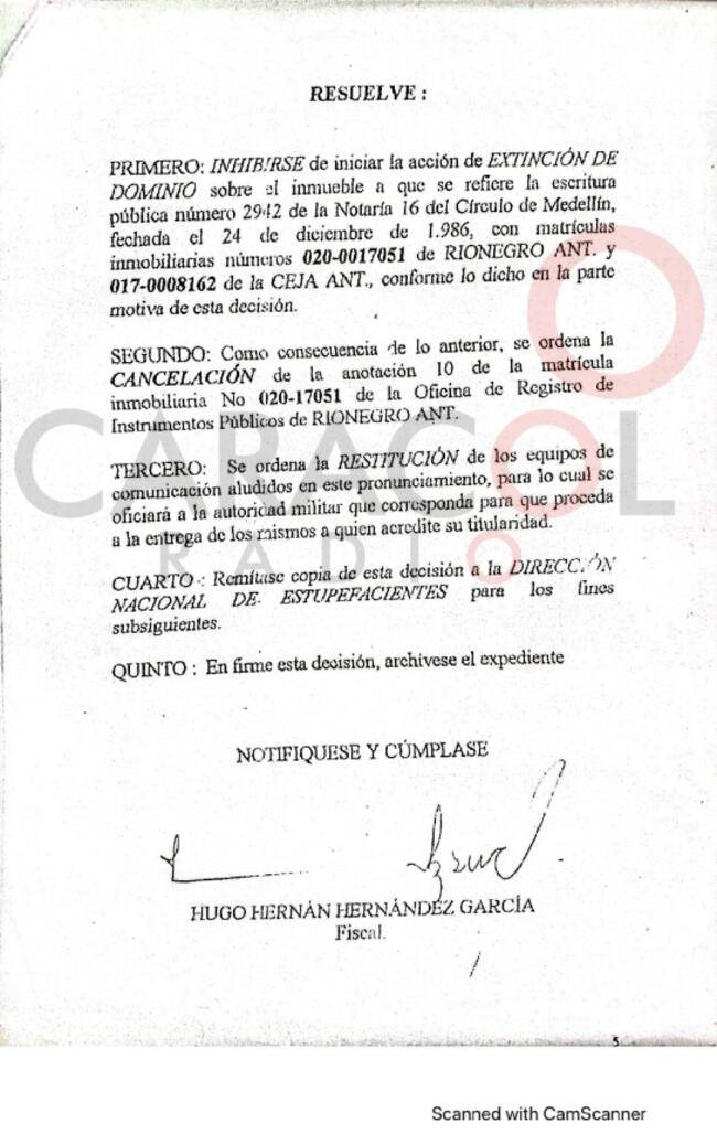 Una de las pruebas con las que el exgobernador Luis Pérez, busca tumbar el decomiso de seis bienes avaluados en $74.000 millones / CARACOL RADIO