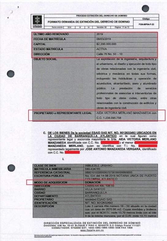 Desde hace dos años la Fiscalía adelanta un proceso de extinción de dominio en contra de los bienes de la prófuga excongresista Aida Merlano. En las pesquisas el ente acusador descubrió que desde el 2019 Aida Victoria Merlano Manzaneda aparece como la representante legal de una compañía de ingeniería, arquitectura y urbanismo denominada ESAID SAS., empresa que figura con un capital de $2.200’000.0000