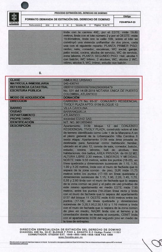 Otro detalle que detectó la Fiscalía es que al momento del traspaso de esos bienes la empresa ESAID SAS. no existía físicamente, es decir, era una compañía ficticia.