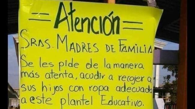 Una escuela de Saltillo, México, está causando revuelvo en las redes sociales, luego de colocar una pancarta en su entrada invitando a las madres de familia a recoger a sus hijos con "ropa adecuada". En dicho aviso se puede ver que prohiben el uso de shorts, minifaldas, blusas escotadas, entre otros.