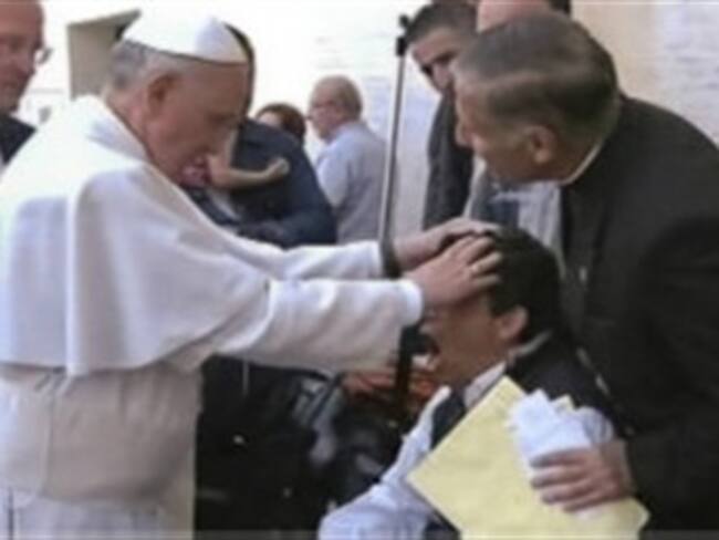 El papa Francisco saludó a un hombre en silla de ruedas y puso sus dos manos sobre la cabeza del discapacitado durante 14 segundos, quien hace gesto de dolor, en ese momento.